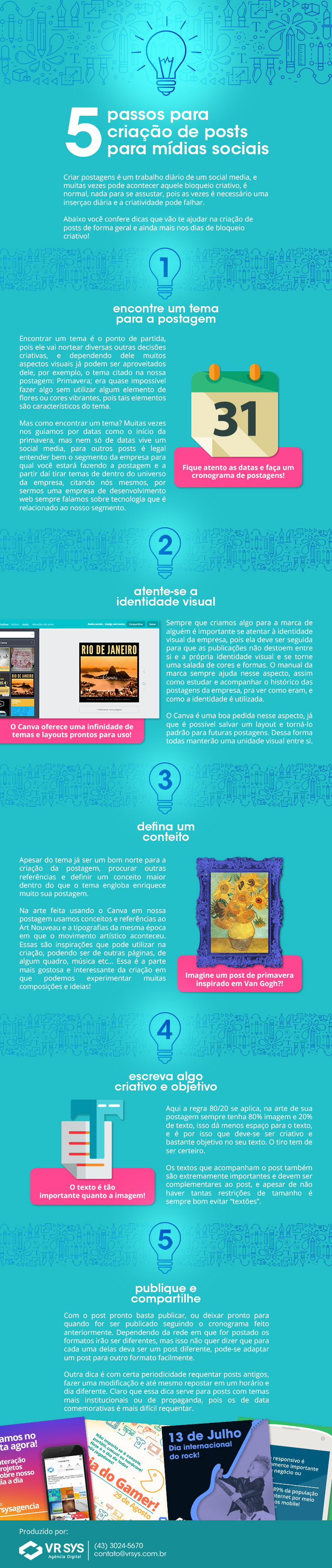 Pronto! Você agora já sabe os principais passos na criação de um post incrível para sua página nas redes sociais no Canva! Abaixo você confere nosso infográfico sobre esses passos de criação que podem ser aplicadas não apenas com o Canva, mas com várias outros meios!